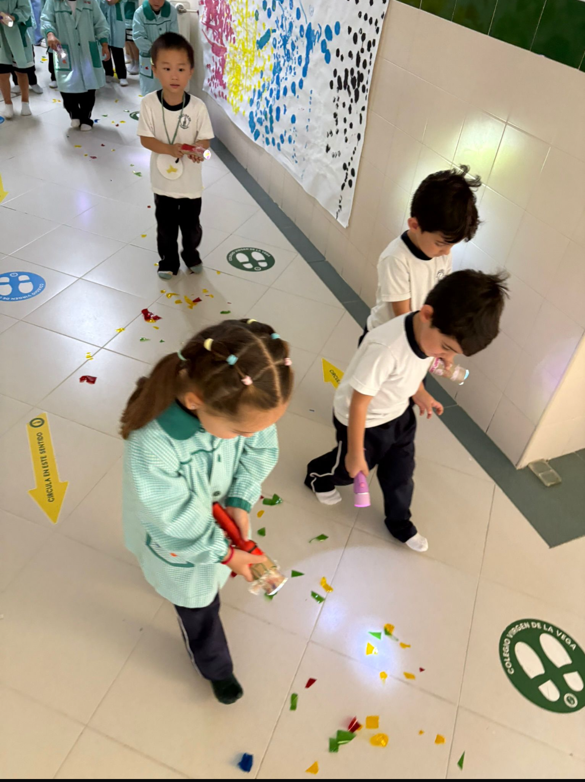 Un sendero de pequeños papeles de celofán de colores nos sugería el camino hacia la sala de psicomotricidad, convertida en un bosque luminoso donde las cajas respiraban color y la luz se movía como si tuviera algo que decir.