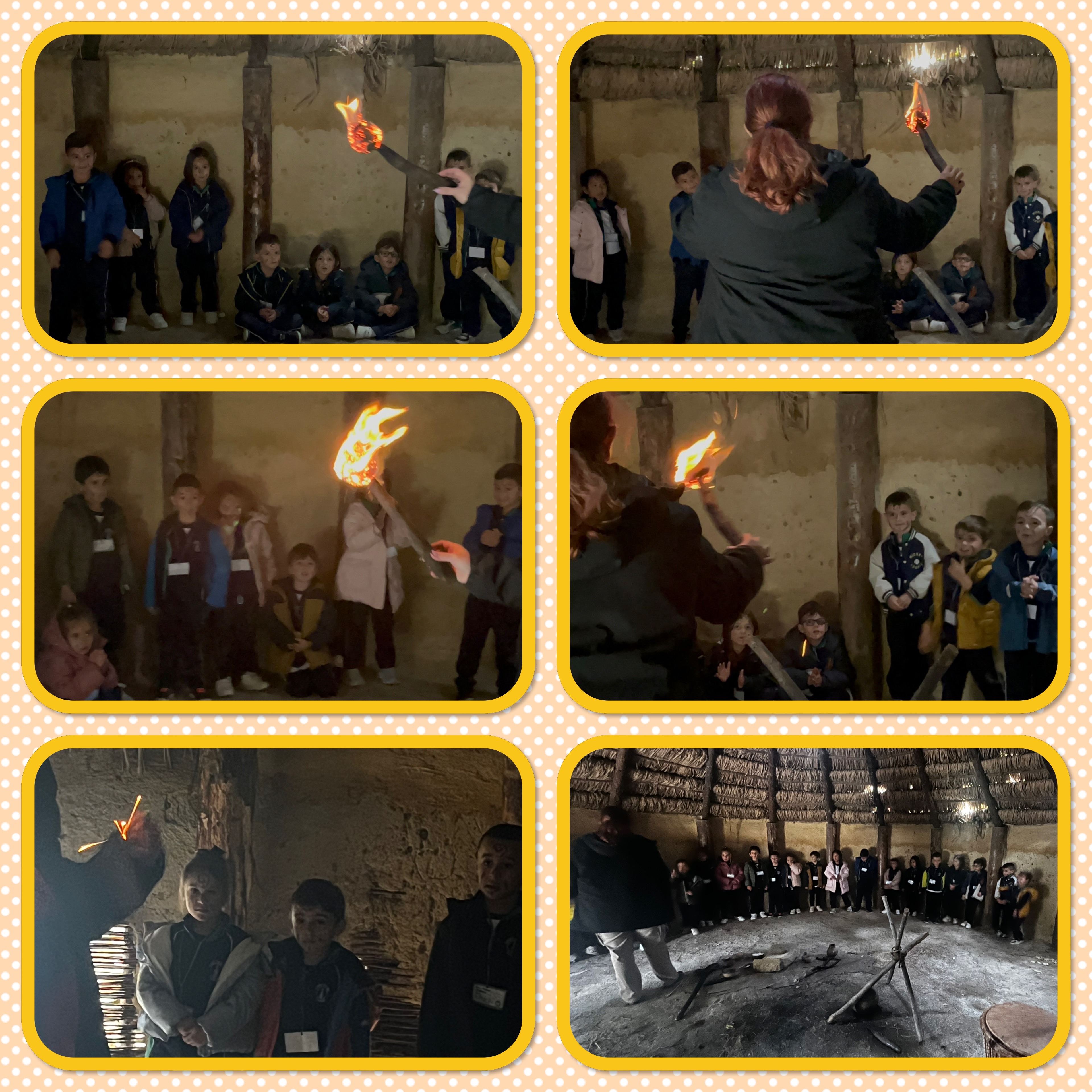 No nos podíamos marchar de allí sin ver cómo y con qué hacían el fuego. Y como no, ¡hicimos fuego! Frotando unos palitos, en un momento teníamos una pequeña hoguera y ¡hasta una antorcha! preparada para iluminar la choza donde estábamos. ¡Qué calentitos con el fuego! Ahora sí que teníamos ganas de poder hacer música con los instrumentos prehistóricos que allí había, así todos juntos y alrededor del fuego.