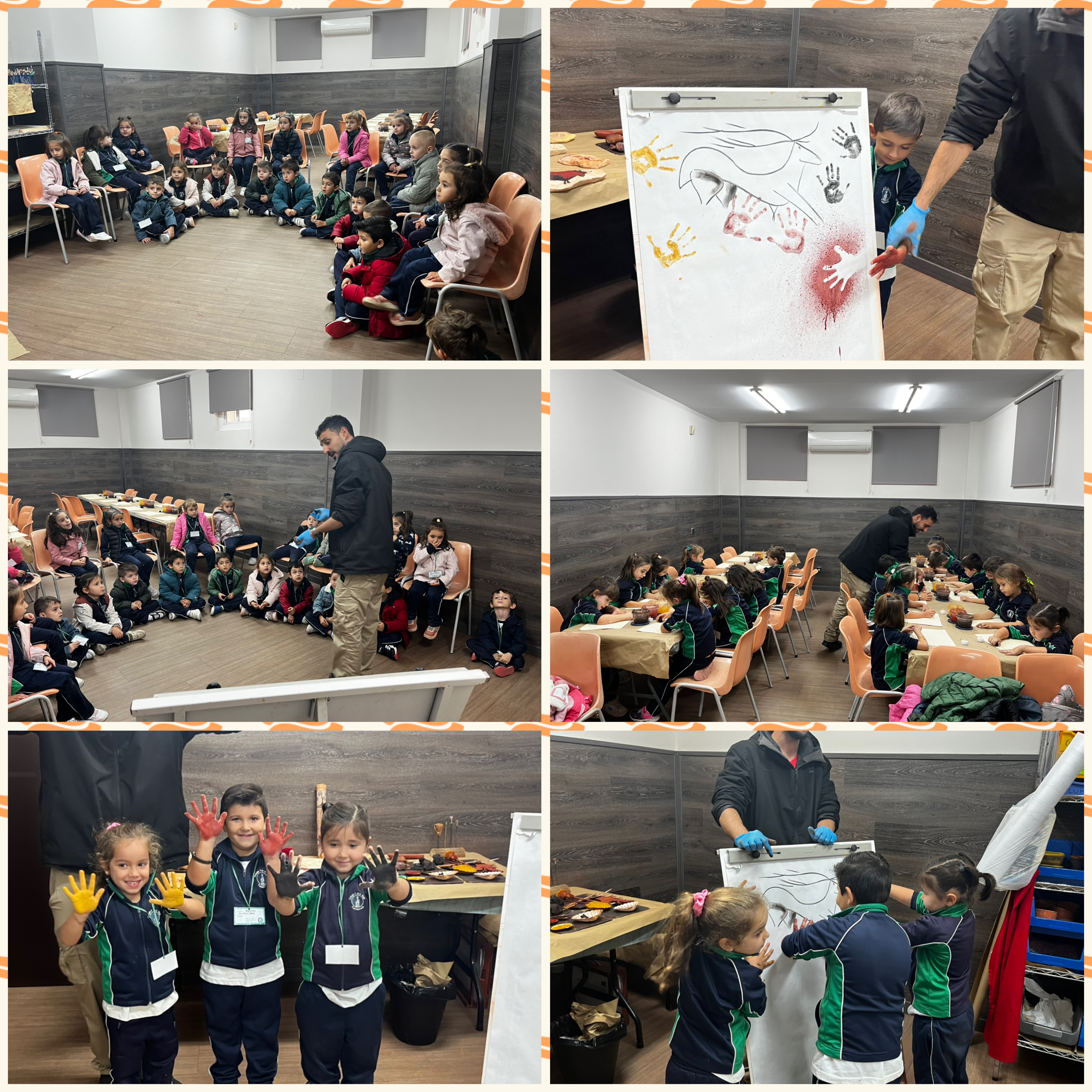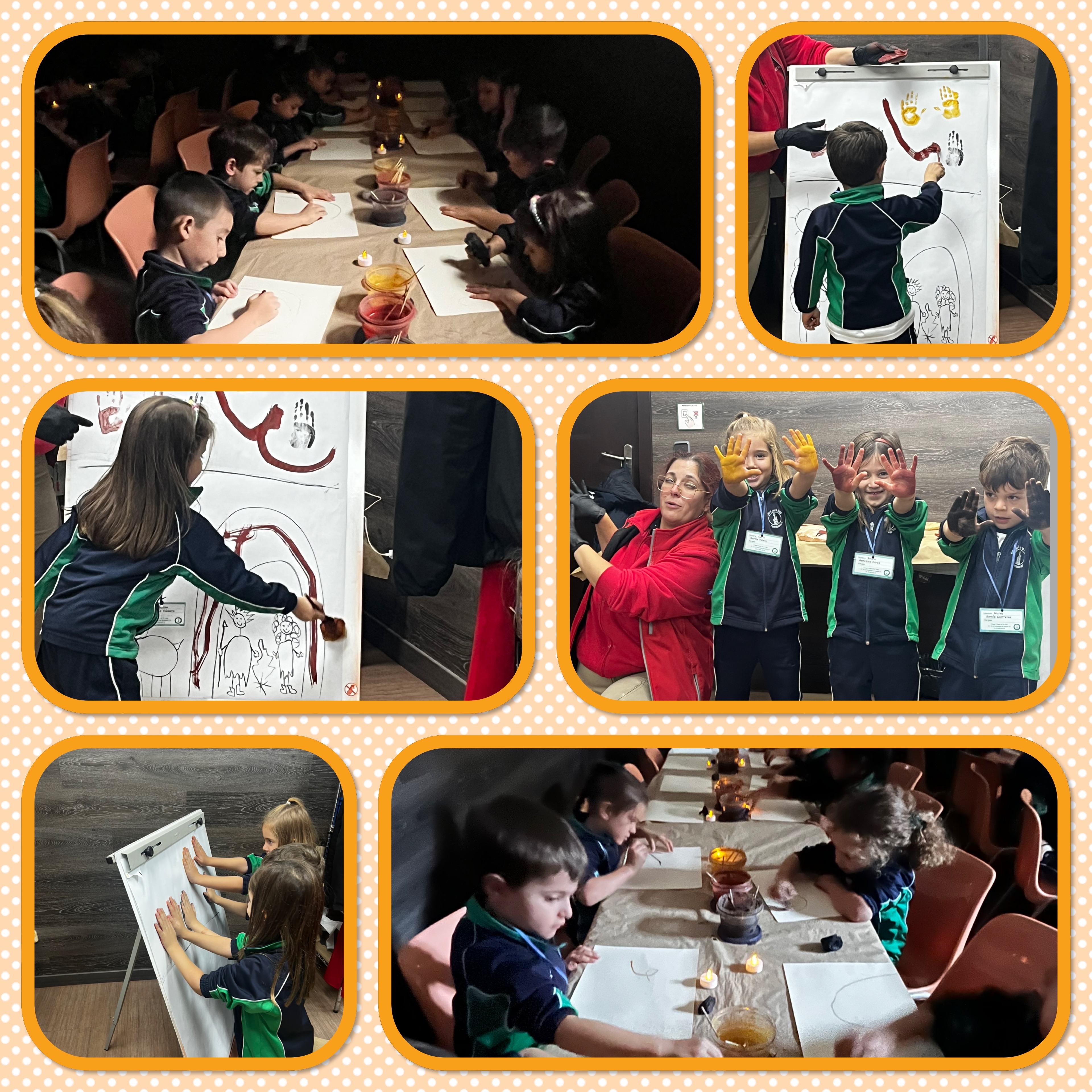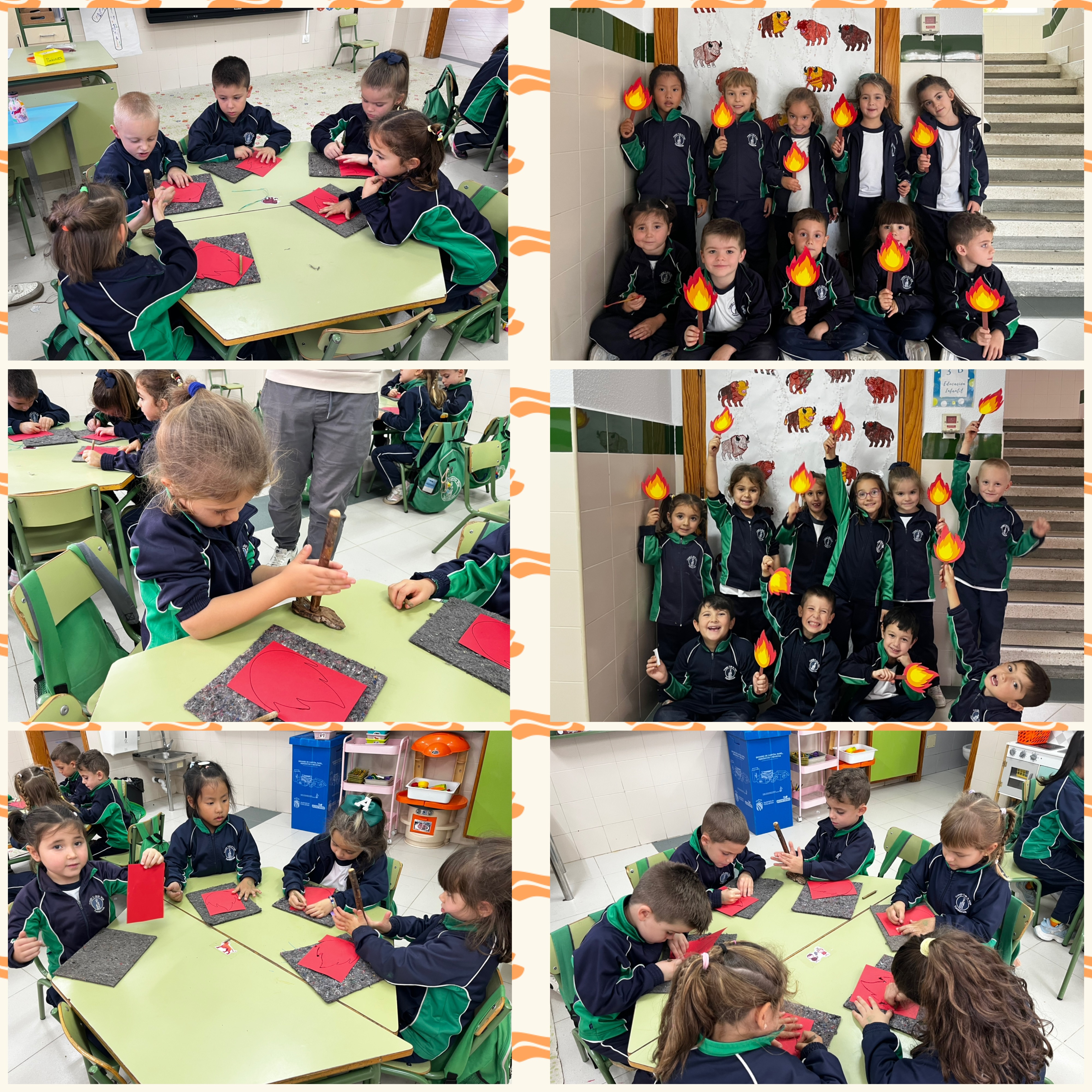De vuelta al cole terminamos la jornada colocando una pintura elaborada entre todos en la puerta de la clase. ¡Qué bien lo hemos pasado y cuánto hemos aprendido sobre la prehistoria! Teníamos más curiosidades sobre el gran descubrimiento de los inicios de la historia, el fuego. Hemos participado en dos talleres en el aula con varias familias que nos han enseñado el origen del fuego y hemos podido llevar a casa una antorcha para iluminar la habitación y un fuego hecho con pintura soplada con forma de hoguera.